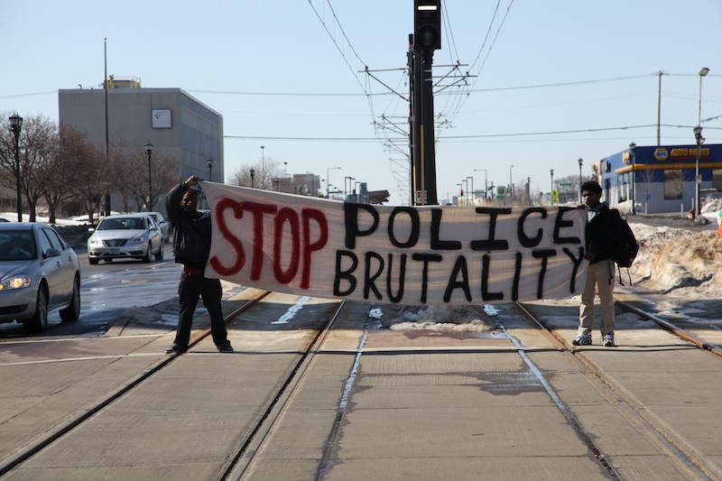Twin Cities youth and their adult allies received supportive honking and shouting from drivers as they gathered with banners at the intersection of University Avenue and Lexington Parkway in St. Paul on March 13. Their aim: to raise awareness about discipline concerns in schools and to demonstrate against the school-to-prison pipeline.