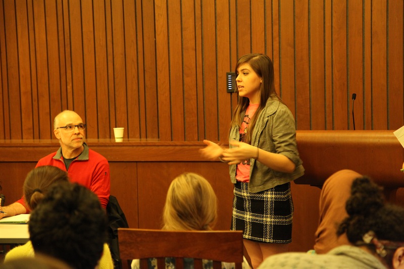 Community organizer Mica Grimm addressed the crowd of protesters.
