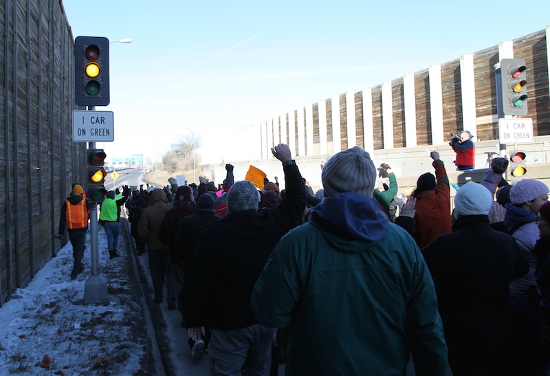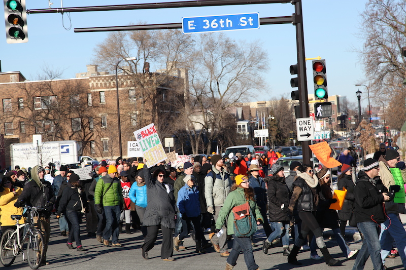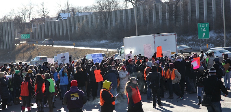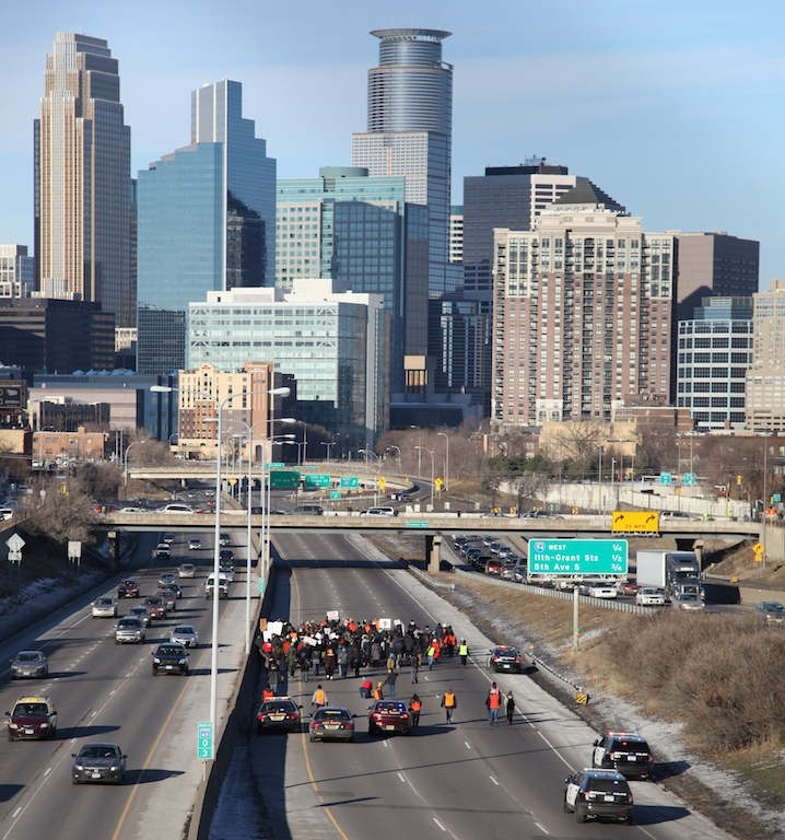 On December 4th, more than 100 demonstrators gathered outside Burger King at the intersection of 34th Street and Nicollet Avenue in South Minneapolis to make their voices heard on two prominent social issues–the struggle for better wages and working conditions for fast food employees and the unjust deaths of people of color at the hands of police across the U.S. The group marched onto I-35W via the 36th Street on-ramp and blocked traffic on the northbound lanes for well over an hour as they made their way downtown toward Minneapolis City Hall.