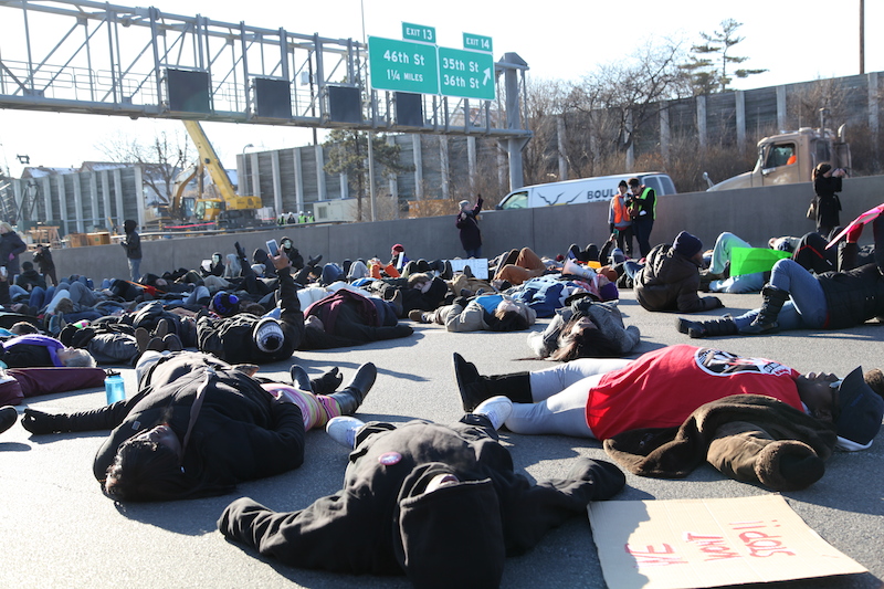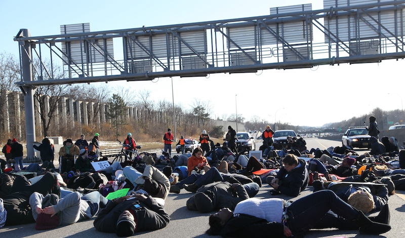 Protesters performed a ‘die-in’ shortly after making their way onto I-35W.